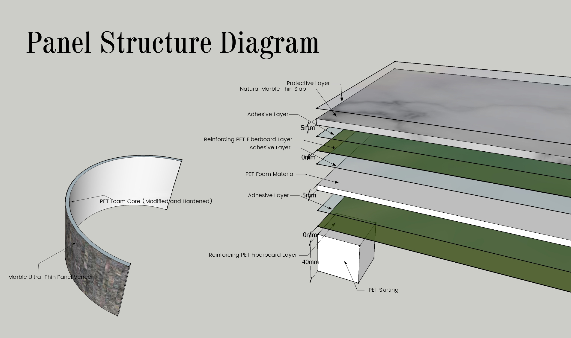 خفيف الوزن ورقيق: يتميز بحجر طبيعي مقاس 3-5 مم مغلف على ركائز مقاومة للماء/الحريق بسمك قابل للتخصيص. يزن أقل من 20 كجم/م² – فقط 1/20 إلى 1/2 وزن الحجر التقليدي.